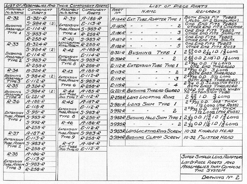 It is apparent upon examining drawing No. 4 that approximately the same assembly is used for quarter size Ross lenses, but in order that there may be no errors, the Ross assembly is given the assembly number R-33, the only difference being the adapter for Ross lenses is B-324-R because the diameter of the quarter size Ross lens is different from that of the series 1 B. & L.
