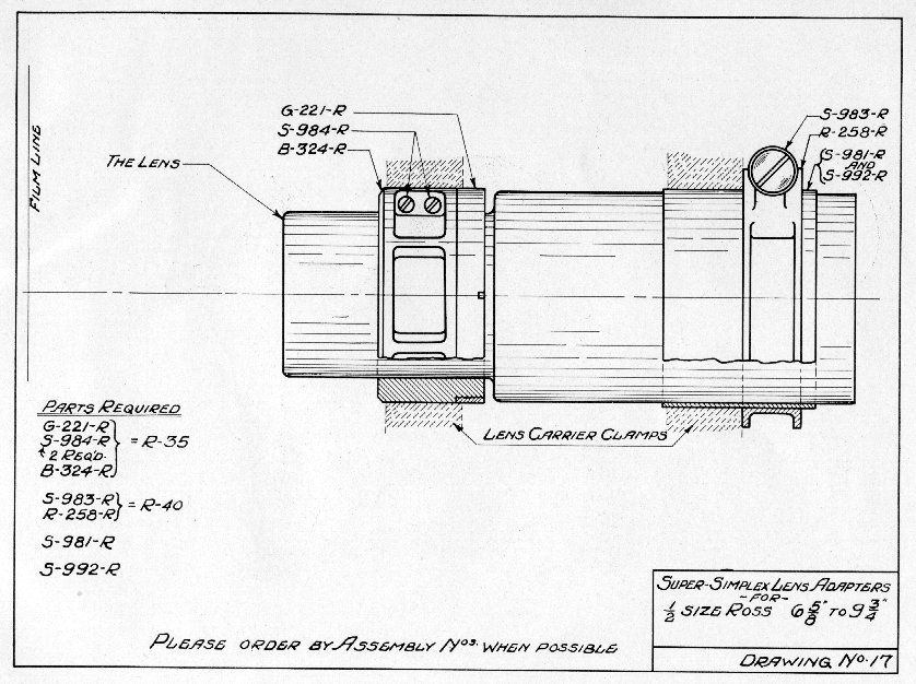 Let us take another example. You are using a 6" half size Ross lens. By referring to drawing No. 1, column 4, we find that assembly drawing No. 16 gives us the desired information and, also, in column 5 assemblies R-35 and R-36 are required. Turning to drawing No. 16 we see the assembly necessary to accommodate the Ross 6" half size lens. We find that the Ross 6" lens as supplied by the manufacturers will fit neither the front nor rear lens clamps in the Super Simplex mount. It is, therefore, necessary to use adapter assembly R-35 to accommodate the lens to the rear lens combination, and an extension tube E-113-R with threaded adapter A-188-R to lengthen the lens that it may be accommodated in the front lens clamp. It was explained in a preceding chapter on lenses that many Ross lenses are under the standard diameter and the 6" Ross lens happens to be one of these. It is, therefore, necessary to use also shim S-981-R or S-992-R, or both, to bring the extension tube E-113-R up to standard dimensions. With the parts mentioned the Ross 6" lens may be assembled as shown on drawing No. 16 and will then fit the Super Simplex lens mount. Drawing No. 16 also shows R-258 in place and, as previously explained, this is a fixed focusing collar, instructions for the use of which have been given under FIXED FOCUS CLAMP.